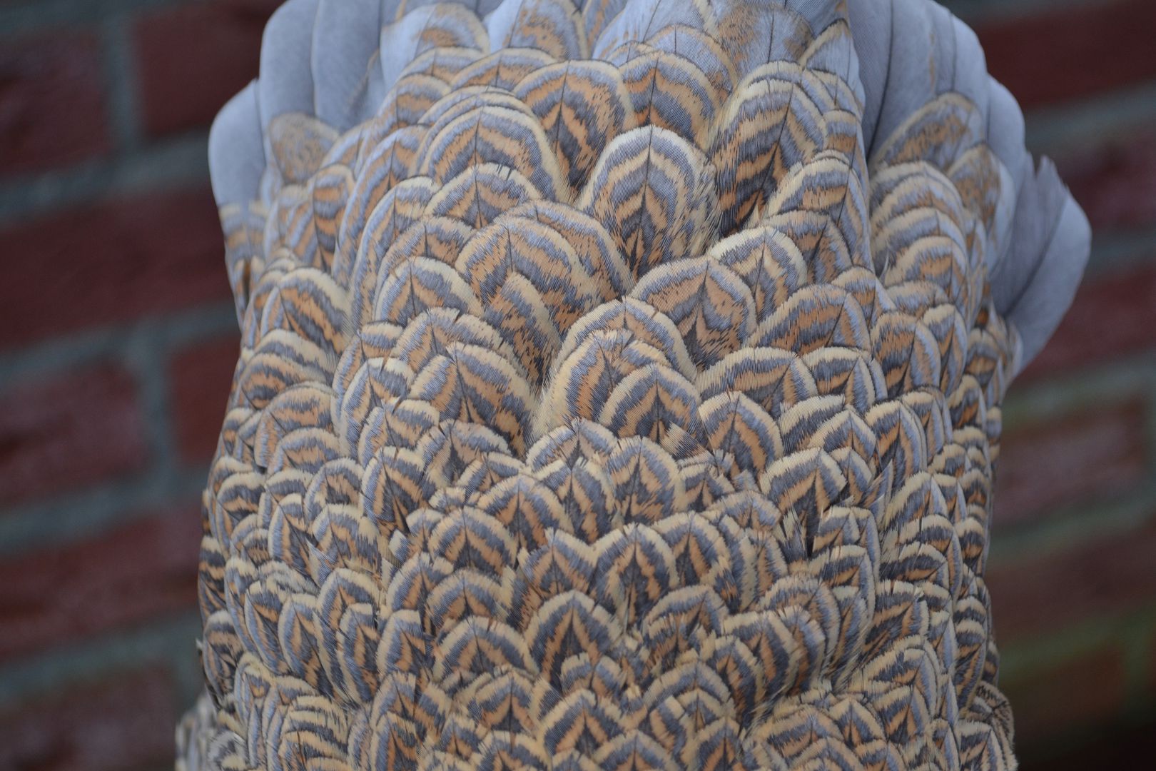 De veren vertonen hetzelfde tekeningpatroon als bij de meerzomig patrijs haan en hen. Alle zwart in de lichaamsbevedering is vervangen door helder, zo gelijkmatig mogelijk blauw.