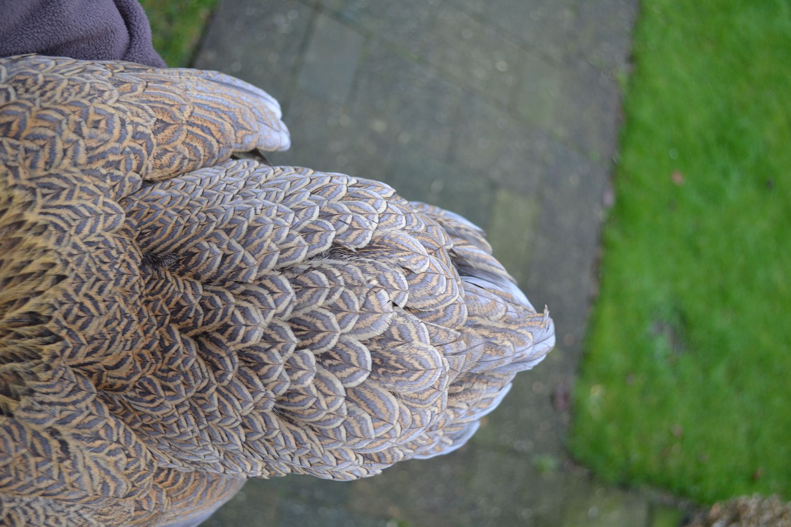 De zwakke of onjuiste tekening in de veren van borst, vleugeldek en rug; roestkleur op vleugels; gepeperde tekening in plaats van duidelijke zoomtekening.