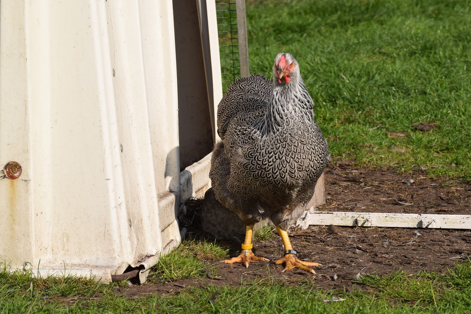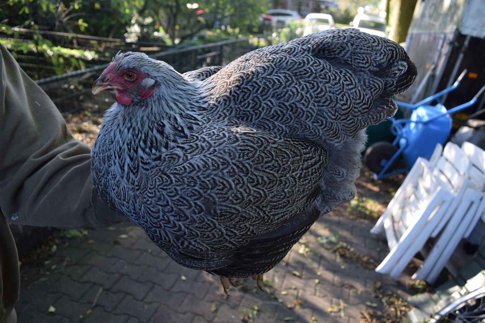 Bij de hen is de grijsachtig geelbruine grondkleur vervangen door staalgrijs.