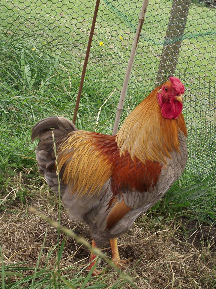 Bovenstaande fouten in mindere mate voorkomend, bovendien te lichte en onvolledig gekleurde vleugeldriehoek bij de haan.