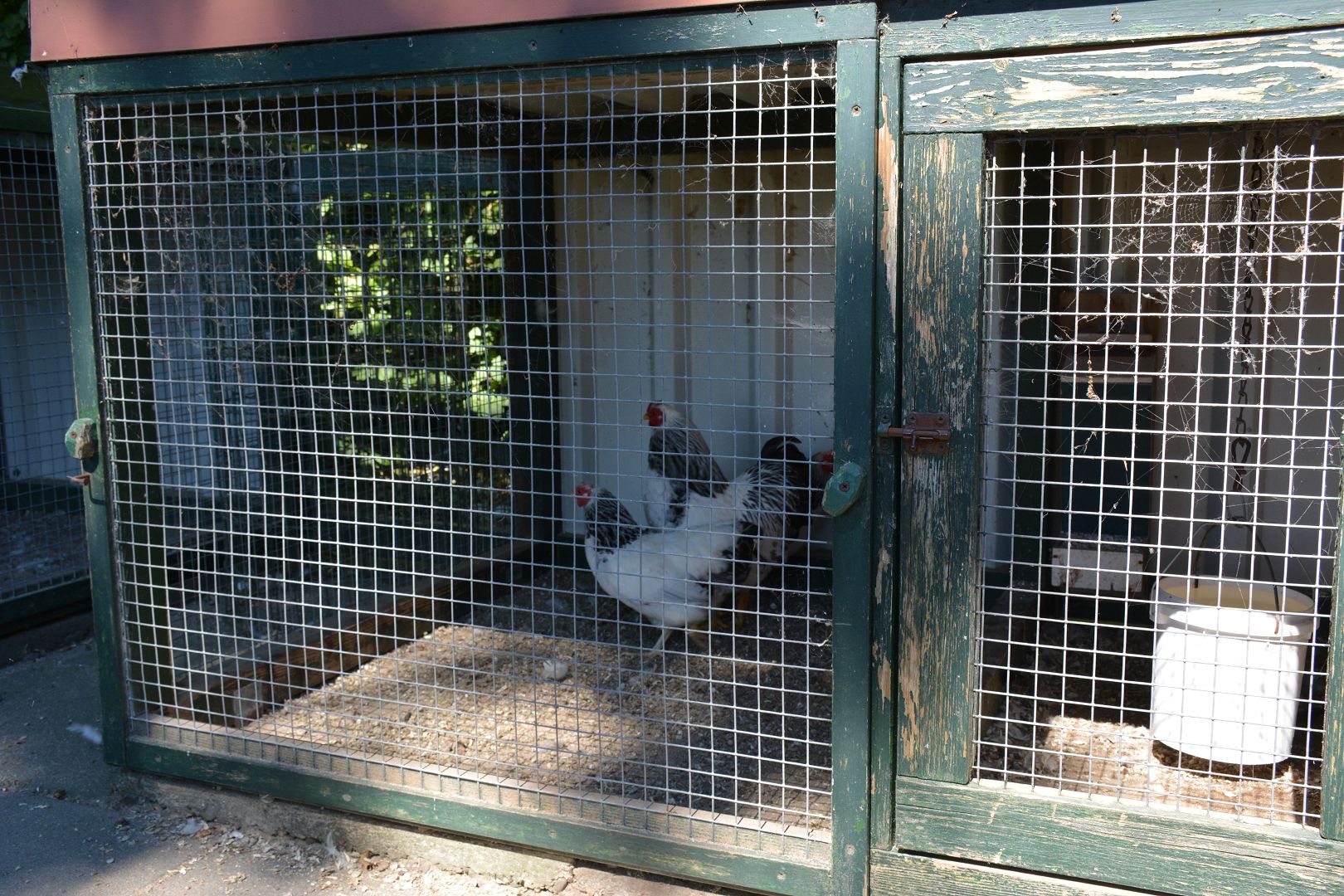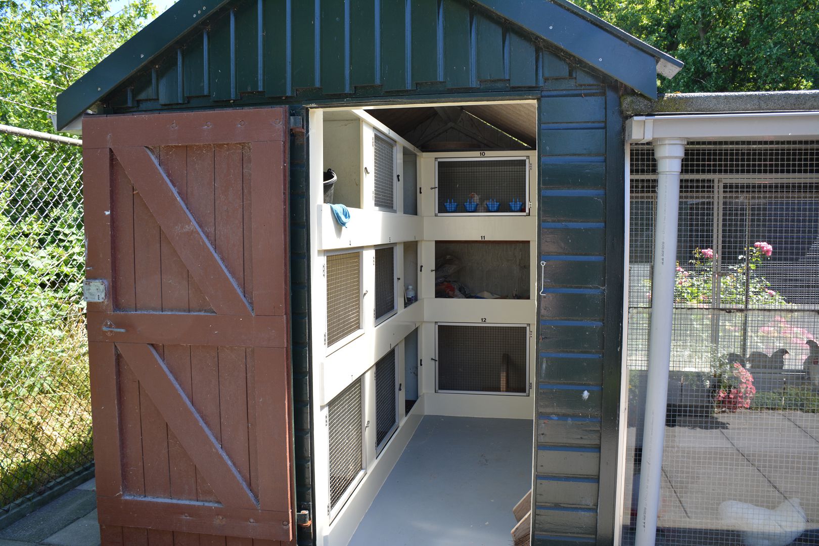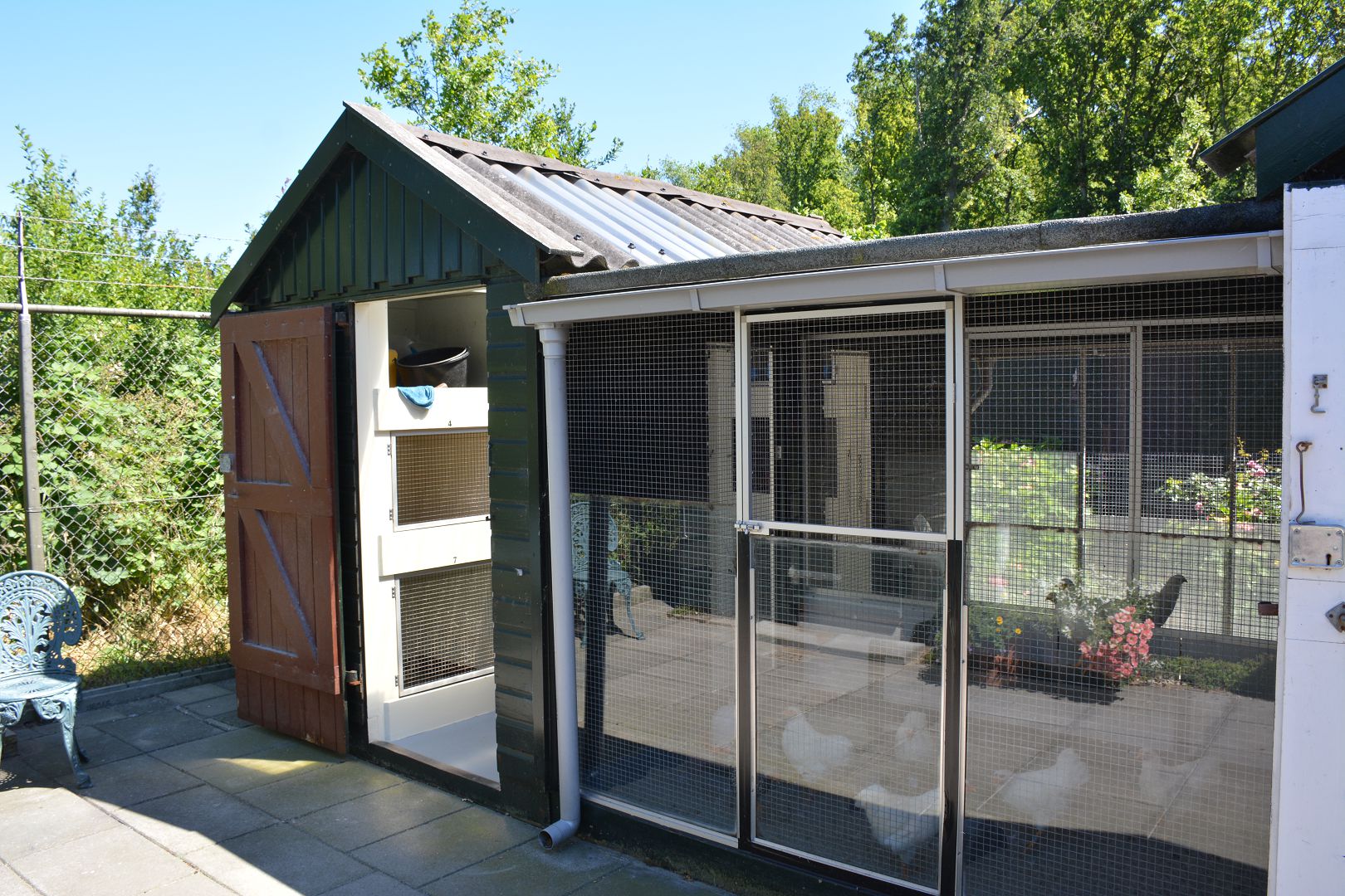 Vervolgens maken we een rondje langs de hokken en door de tuin. Een drietal hokken staan vlak naast het huis met de oude foktomen. Dit jaar waren er niet veel kuikens, slechts één wit zwartcolumbia. Bij twee hokken mogen de dieren om en om een dag op het gazon. Helemaal achter staat op een groot stuk gras het hok met de jonge dieren en nog verder naar achteren de moestuin.