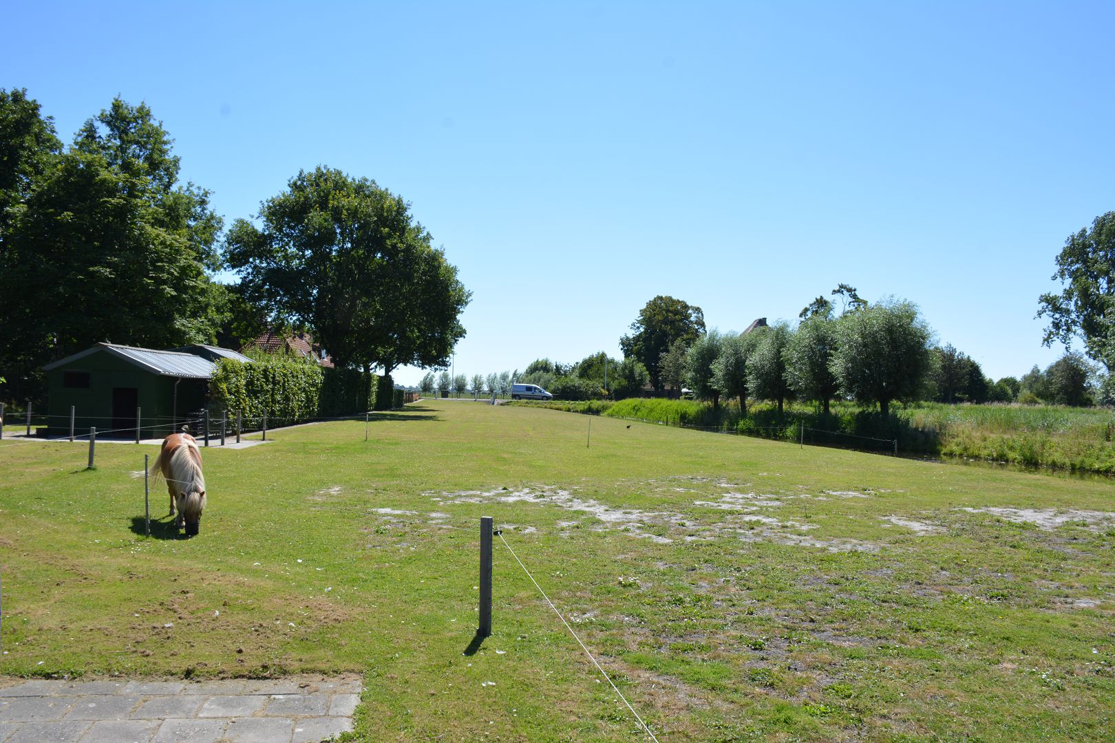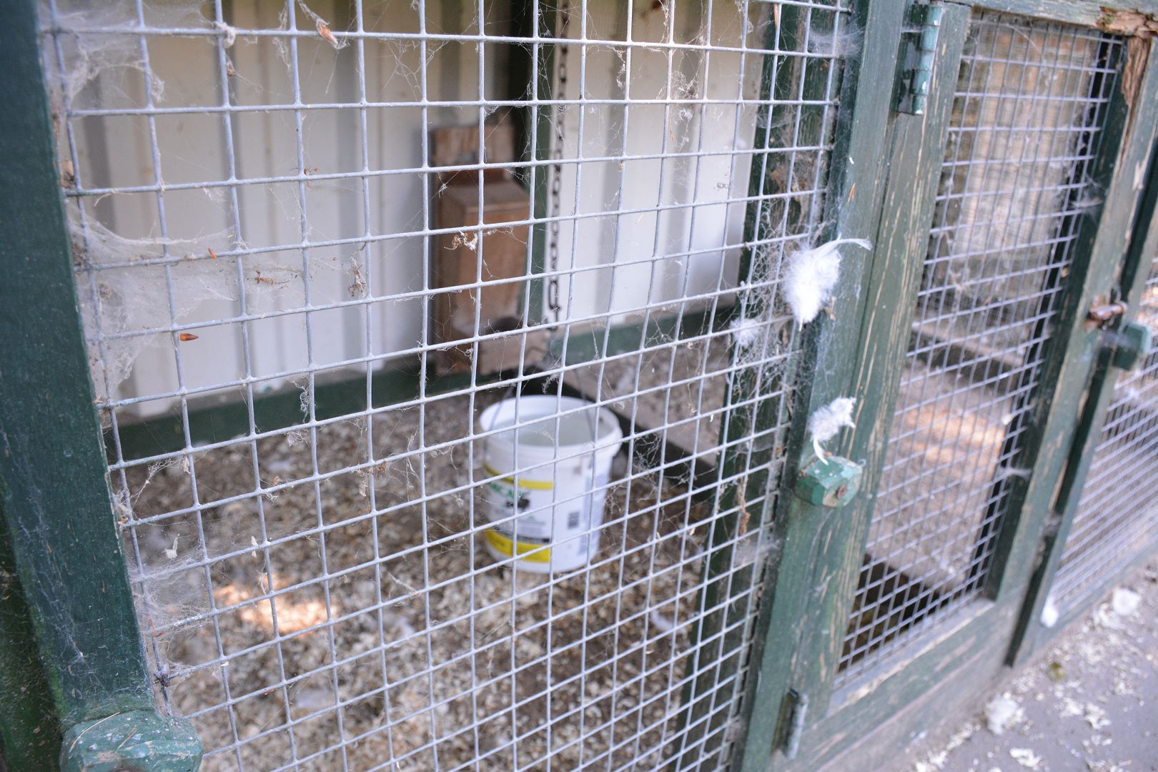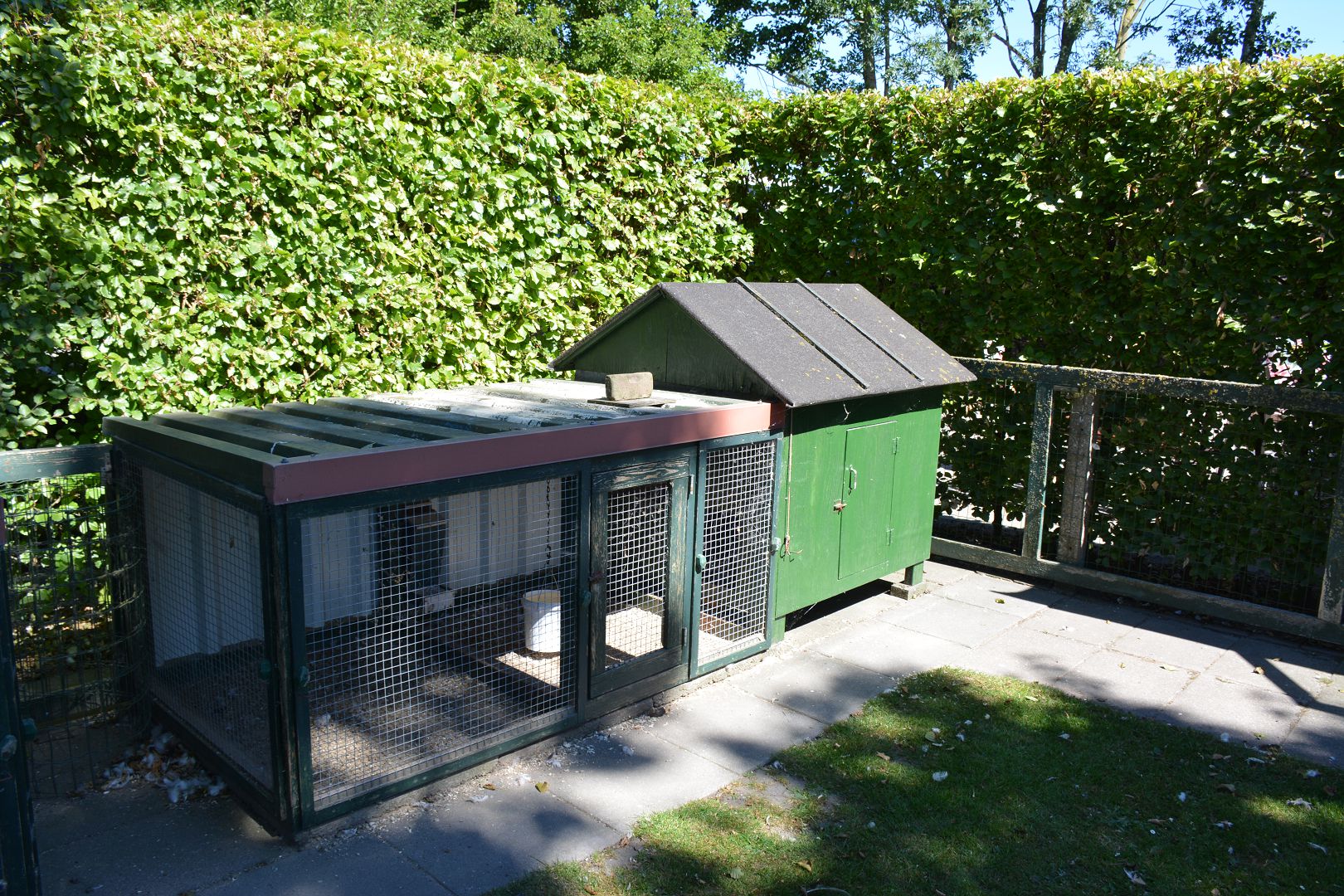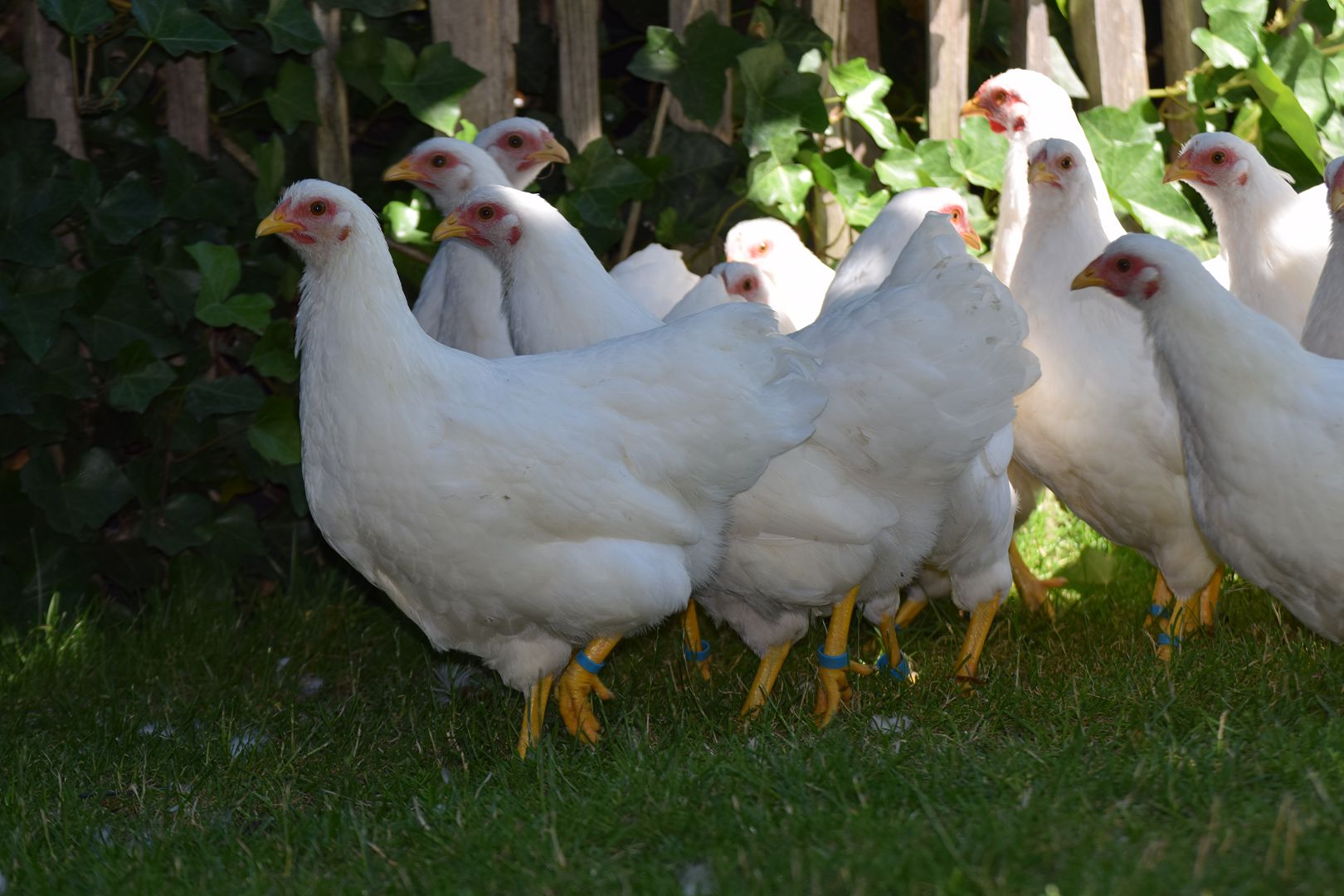 Vervolgens maken we een rondje langs de hokken en door de tuin. Een drietal hokken staan vlak naast het huis met de oude foktomen. Dit jaar waren er niet veel kuikens, slechts één wit zwartcolumbia. Bij twee hokken mogen de dieren om en om een dag op het gazon. Helemaal achter staat op een groot stuk gras het hok met de jonge dieren en nog verder naar achteren de moestuin.
