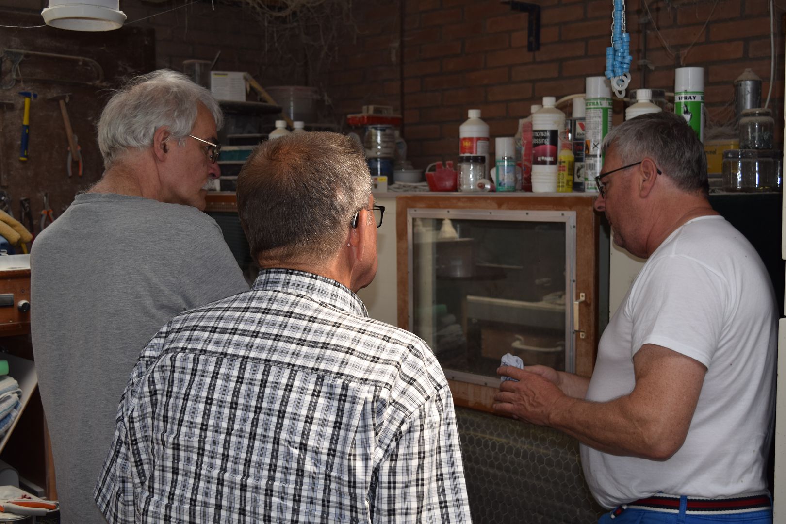 Ook zijn hulpmiddeltjes bij het tijdelijk ringen van jonge dieren worden gedemonstreerd. Om 15:00 gaan we te voet naar het clubhuis en de dierenverblijven. Leo huurt er twee van de totaal negen hokken. Een daarvan heeft een tweetal overdekte rennen. Een voordeel van een dergelijk terrein is dat men elkaar kan helpen door bij vakantie de dieren te verzorgen. In het clubhuis kan de jongdierendag worden ondergebracht en af en toe levert de verhuur nog iets op, want veel vergaderen gebeurt niet meer. Voor ons locatieprobleem met de Wyandotteshow is het geen oplossing: te klein en erg ver weg voor de meeste inzenders.