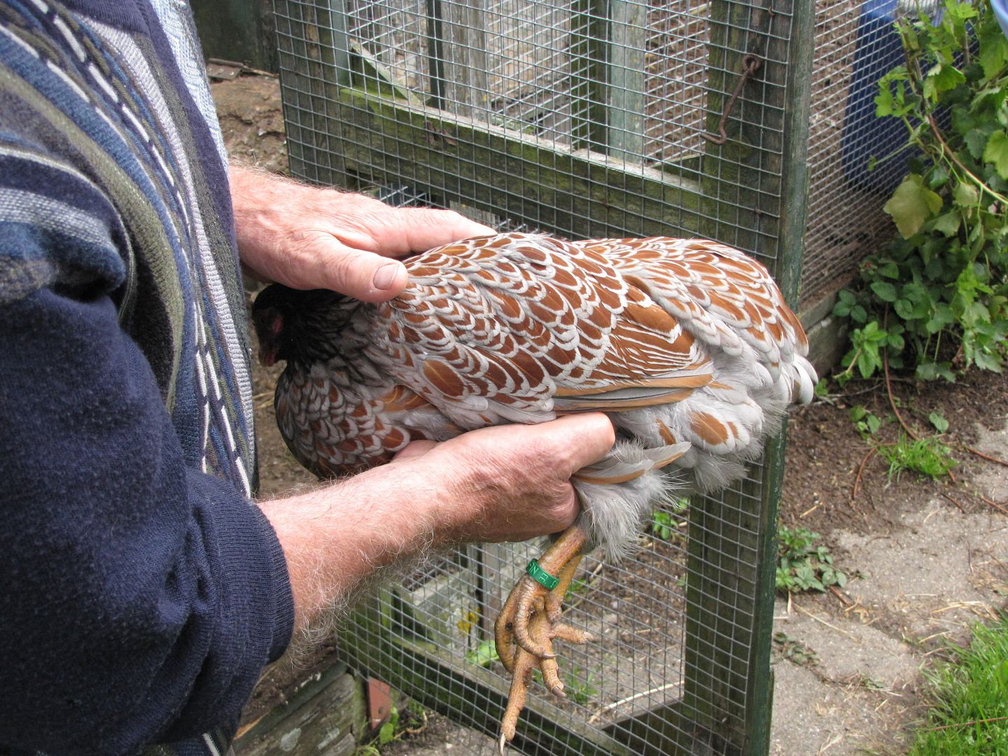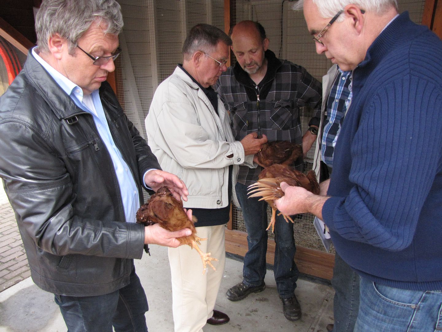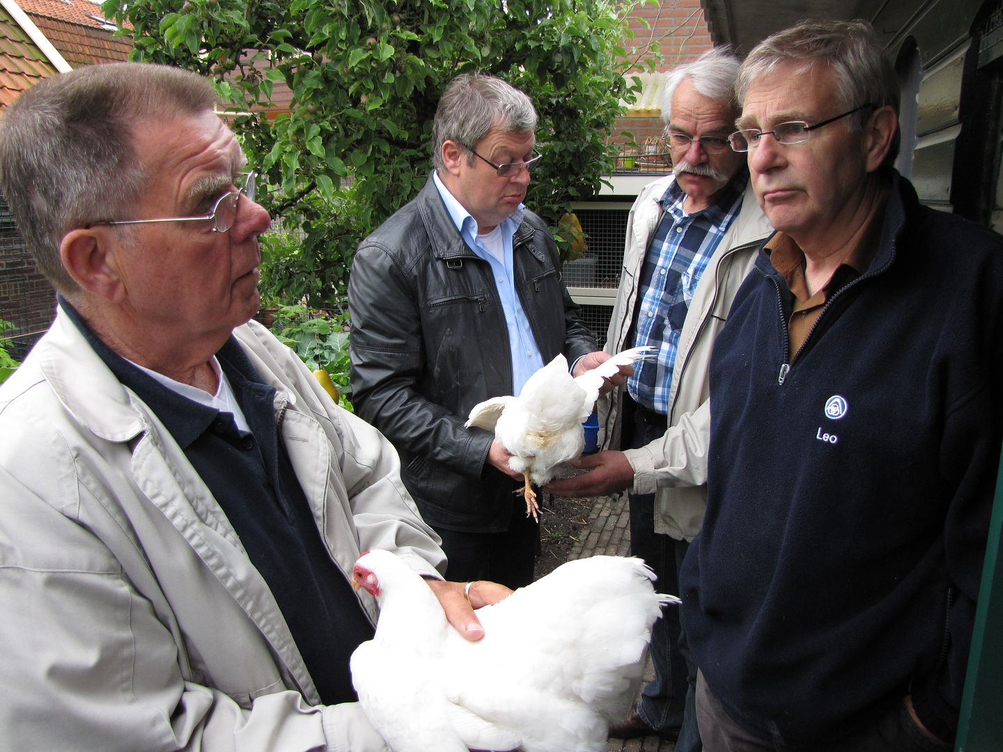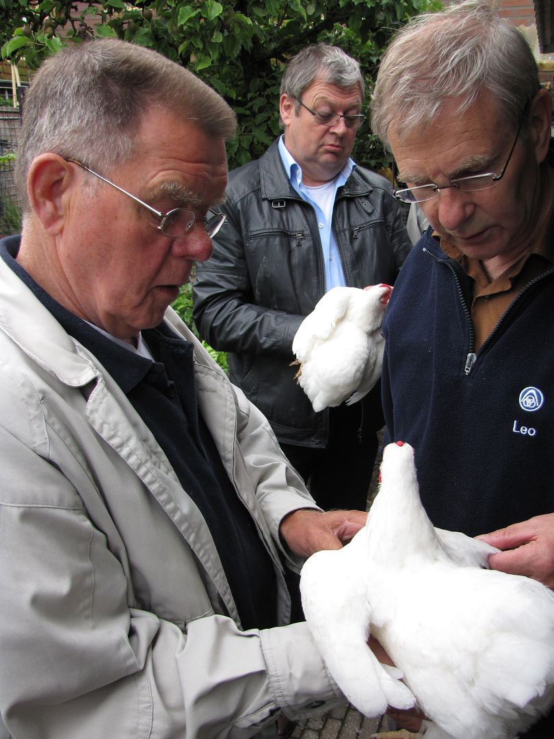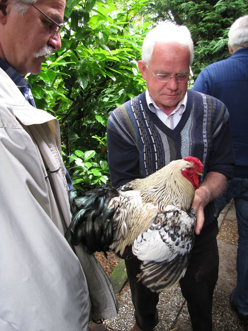 Om 8.15 uur werd ik opgepikt door Benny Wittenbernds en in tegenstelling tot andere jaren was het zwaar bewolkt, dus geen korte broek. Tegen 9.45 uur kwamen we aan bij Leo van der Schelling in Krimpen aan de IJssel, die woonde in een wijk vol smalle straten en opeengepakte huizen. Zijn vrijstaande woning bleek echter over een grote tuin van 1000 m2 te beschikken; oorspronkelijk had zijn vader hier een huis twee deuren verder met zoveel grond dat hij er o.a. 400 - 500 legkippen op kon houden. Later werd alles volgebouwd, maar er werd een flink stuk grond zelf gehouden. Leo fokt witte Wyandottekrielen en had vorig jaar veel kuikens, maar dit jaar geen een. Zijn foktoom van 5 dieren zag er gezond uit. Wel had de haan een vreemde witte plek op zijn kam. De bevruchting was slecht, maar een van de mogelijke oorzaken kan zijn dat er sprake is van luis.