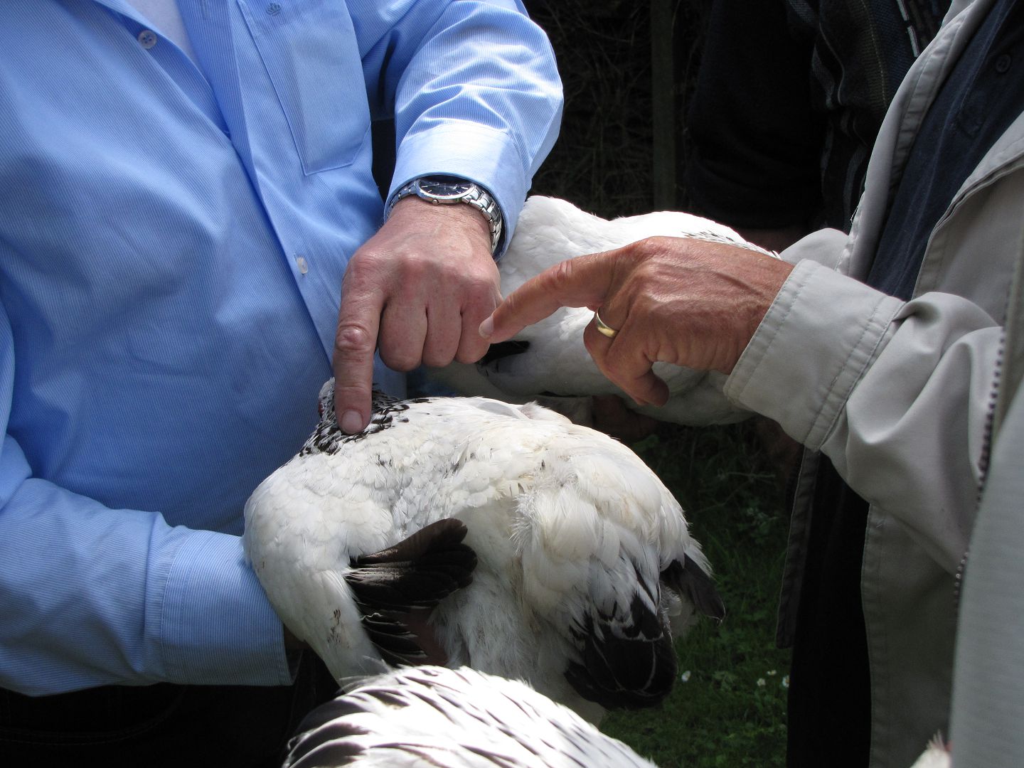 We gaan de tuin in en bekijken zijn foktoom. De haan wordt beoordeeld als teveel crème en daar kun je beter niet mee fokken omdat je dat niet kwijt raakt in je nakomelingen. Gewezen wordt op de oogkleur en de breedte van de grote slagpennen. Gezichtsbevedering moet minder. Zeker in de witte kleurslag is in Nederland goed fokmateriaal te vinden. De witte drie plekken op de hanenkam kunnen we niet thuis brengen. Zwart in de vleugelpennen is niet goed. Pas ook op voor te dunne (bijna doorzichtige) veren.