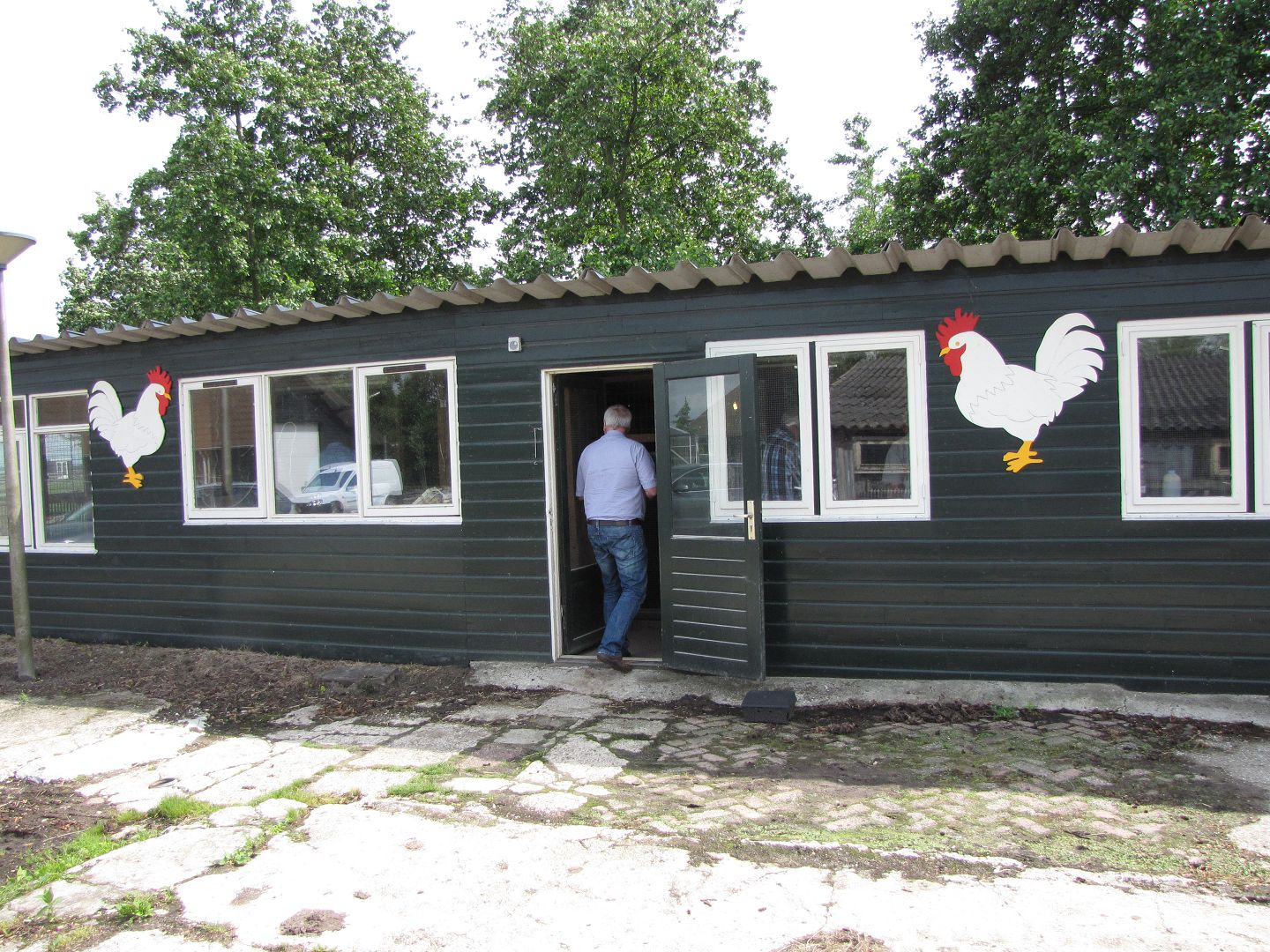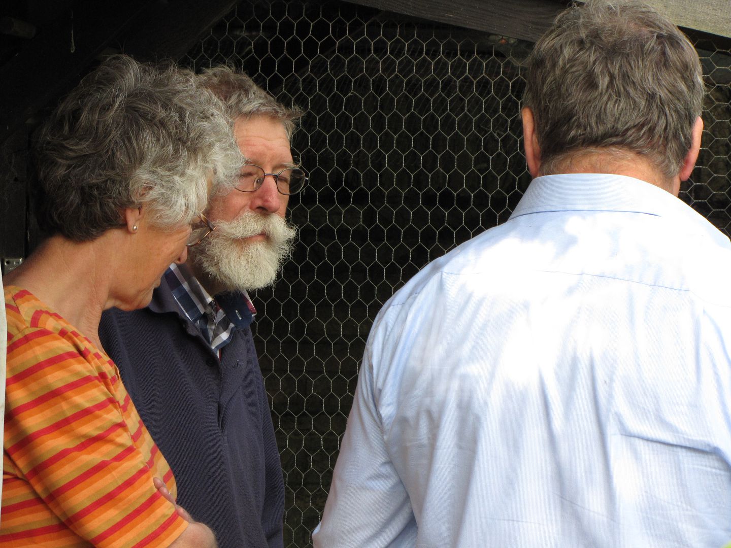 Om 13.00 uur vertrekken we naar de volkstuin van Martin. Hier lopen enkele foktomen en veel van de jonge dieren. Eerst een hok met vier afdelingen waar hij ons de problemen laat zien bij enkele jonge hanen. Vervolgens gaan we naar de grote kippenschuur met aangebouwde rennen (geheel gesloten met gaas) met op de bodem boomschors. Martin heeft last van nogal drassige grond. De eieren worden bewaard in een “kist” gemaakt van tempex tegen temperatuurschommelingen. Er staat ook een tuinhuis in aanbouw en hij heeft Campbell eenden, die in de aangrenzende sloot kunnen zwemmen.